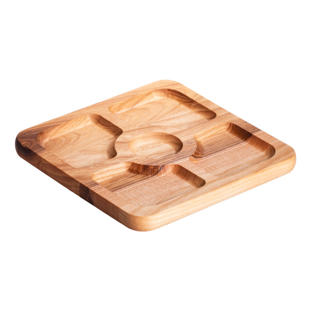 Деревянная менажница — это функциональный и эстетичный аксессуар для сервировки стола, который сочетает в себе практичность, экологичность и изысканный дизайн. Деревянная менажница размером 25×25 см с пятью секциями, выполненная из натурального ясеня, станет не только универсальным решением для подачи блюд, но и украшением вашего интерьера. Основные характеристики менажницы на пять секций Материал - ясень (натуральное дерево высокой плотности); Длина 25 см; Ширина 25 см; 5 секций; Форма - квадратная; Покрытие: масло для защиты древесины и сохранения её текстуры; Назначение: подача закусок, мясных блюд, сыров, суши и роллов, соусов, фруктов, орехов и др. Особенности и преимущества тарелки менажницы с секциями Менажницы из дерева производятся из натурального сырья — древесины ясеня, известной своей прочностью, устойчивостью к механическим повреждениям и красивой текстурой. Натуральное покрытие на основе масла не только подчеркивает природную текстуру, но и защищает поверхность от влаги, продлевая срок службы изделия. Такая деревянная менажница абсолютно безопасна для здоровья и подходит для ежедневного использования. Квадратная деревянная менажница оснащена пятью удобными секциями, которые позволяют разделять разные виды закусок. Это делает её идеальной для подачи сыров, мясных деликатесов, суши и роллов, орехов, фруктов или соусов. Компактный размер 25×25 см позволяет использовать её на любом столе, а функциональность и дизайн обеспечивают универсальность применения. Менажница с разделителями идеально подходит для самых разнообразных блюд: Менажница деревянная для сыра - разделите сорта сыра, добавив к ним фрукты, орехи или мёд. Менажница для мяса - используйте для сервировки мясных деликатесов или запечённых продуктов. Деревянная менажница для суши и роллов - отличный выбор для любителей японской кухни. Разместите суши, васаби и соевый соус в отдельных секциях. Деревянная тарелка для закусок - для орехов, крекеров, овощей или снеков. Менажница из дерева имеет натуральный оттенок и элегантный внешний вид, что делает её не только посудой, но и элементом декора. Она подчеркнёт ваш вкус и добавит изысканности любому событию. Менажница из дерева — это универсальный и практичный подарок для друзей, коллег или родственников. Её оригинальный дизайн и универсальность делают её подходящим вариантом на такие случаи, как новоселье, свадьба, день рождения, новый год или другие торжества. Преимущества использования Доска-менажница для подачи легко моется вручную с использованием мягких моющих средств. Рекомендуется избегать длительного контакта с водой и агрессивных чистящих составов, чтобы сохранить текстуру дерева и защитное покрытие. После, изделие нужно тщательно вытирать и сушить в вертикальном положении. Менажница на пять секций, изготовленная из ясеня, выдерживает интенсивное использование и надолго сохраняют свою эстетичность. Благодаря прочному материалу и защитному покрытию, изделие устойчиво к появлению трещин, деформации и повреждений. Деревянная менажница для подачи позволяет создать стильную сервировку с минимальными усилиями. Она становится центральным элементом стола, подчёркивая натуральную красоту подаваемых блюд. Менажницы из дерева — это идеальное решение для сервировки блюд на небольших столах или
