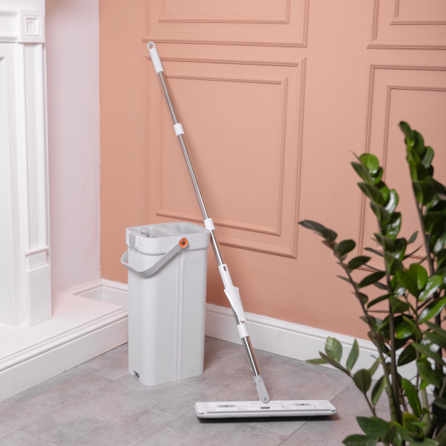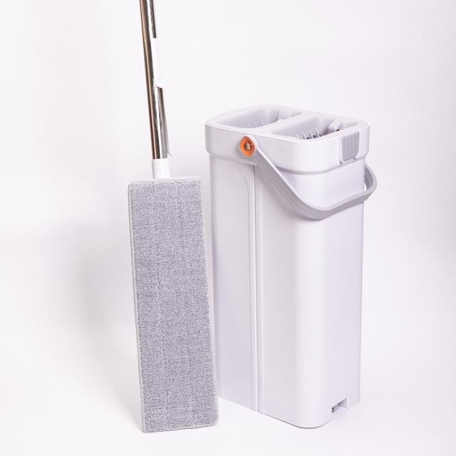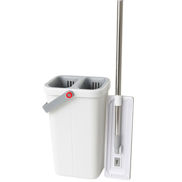 Набор для уборки включает плоскую швабру и двухсекционное ведро с системой очистки и отжима. Швабра оснащена прямоугольной платформой с центральным креплением для насадки. Ручка изготовлена из нержавеющей стали и дополнена пластиковым соединением у основания. Конструкция позволяет использовать сменные насадки из микрофибры, которые фиксируются липучками или зажимами. Характеристики набора для уборки с плоской шваброй и двухсекционным ведром с отжимом: Вес: 2,1 кг; Габариты товара: 24×18×47 см; Размеры насадки швабры: 40×12 см; Материал ведра: пластик; Комплектация: плоская швабра + двухсекционное ведро с отжимом; Максимальная длина ручки швабры: 131 см; Прорезиненная ручка: да; Материал насадки: микрофибра; Материал ручки швабры: нержавеющая сталь; Функция отжима: механический принцип действия; Форма ведра: прямоугольная; Объем ведра: 8 л. Ведро выполнено из прочного пластика и имеет две камеры — для мытья и для отжима. Внутри каждой секции расположены вставки с вертикальными ребрами, которые способствуют эффективной очистке насадки. Боковые ручки оснащены оранжевыми поворотными фиксаторами, обеспечивающими удобное и безопасное перенесение. Основание ведра устойчивое и дополнено закругленными углами. Комплект предназначен для регулярной уборки в доме и небольших офисных помещениях. Раздельные камеры позволяют избегать контакта рук с грязной водой. Плоская форма швабры облегчает уборку под мебелью и в узких местах. Компактные размеры набора обеспечивают удобное хранение в шкафу или кладовке. Преимущества набора для уборки с плоской шваброй и двухсекционным ведром: швабра с прямоугольной платформой и сменными насадками из микрофибры; ручка из нержавеющей стали с удобным пластиковым соединением; двухсекционное ведро для мытья и отжима с вертикальными ребрами; поворотные фиксаторы для надежного переноса; устойчивая основа с закругленными углами; компактные размеры для удобного хранения.