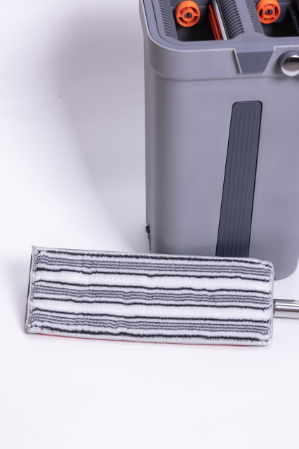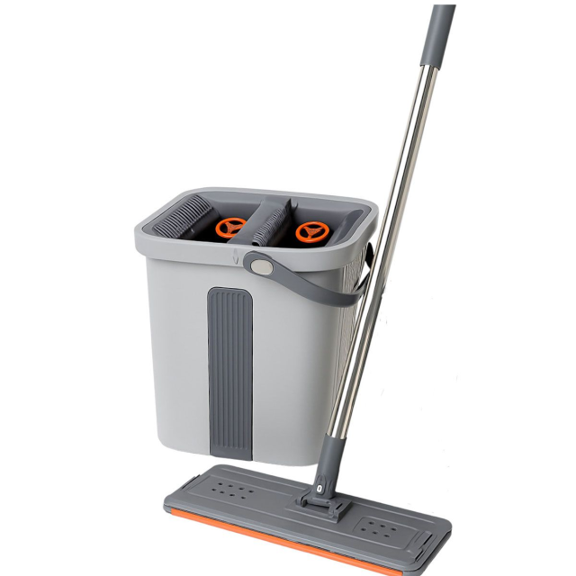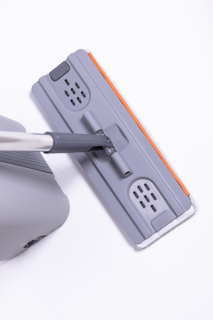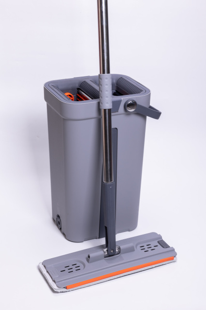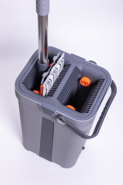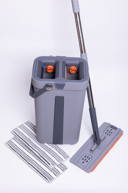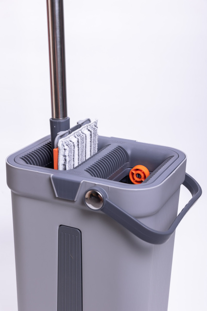 Набор для уборки состоит из плоской швабры и двухсекционного ведра с системой отжима. Ведро изготовлено из прочного пластика и оснащено центральной вставкой. В верхней части расположены два отдельных отверстия: одно предназначено для влажной очистки, другое — для удаления излишков воды. Встроенные решетки обеспечивают равномерный отжим насадки без лишних усилий. Ручка ведра имеет поворотное крепление, что делает перенос более удобным. Швабра оснащена плоской прямоугольной насадкой из микрофибры, которая плотно прилегает к полу. Основание насадки имеет два ряда отверстий для дренажа и оранжевую вставку по краю. Насадка фиксируется к металлической ручке через шарнирный механизм, позволяющий изменять угол наклона во время уборки. Телескопическая ручка выполнена из нержавеющей стали и имеет темно-серое покрытие в зоне захвата для комфортного использования. Характеристики комплекта для уборки дома: Габариты товара: 24×20×40 см Габариты насадки швабры: 34×13 см Материал ведра: пластик Объём ведра: 10 л Максимальная длина ручки швабры: 140 см Минимальная длина ручки швабры: 87 см Материал ручки швабры: нержавеющая сталь Прорезиненная ручка швабры: да Функция отжима: есть Преимущества набора для уборки со шваброй и ведром: плоская швабра с микрофиброй для эффективной очистки; двухсекционное ведро для разделения чистой и грязной воды; встроенные решетки для качественного отжима без усилий; телескопическая ручка из нержавеющей стали; компактное хранение в доме или офисе. Набор подходит для регулярной уборки твердых покрытий — плитки, ламината, паркета. Двухсекционное ведро позволяет разделять чистую и грязную воду, что повышает эффективность мытья. Компактные размеры обеспечивают удобное хранение дома или в офисе.