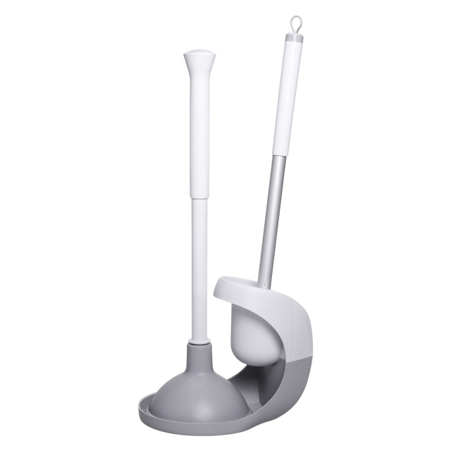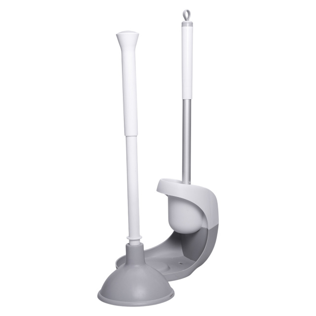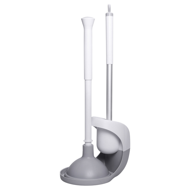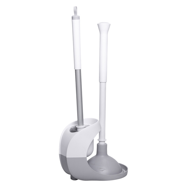 Комплект для очистки туалета включает вантуз и щетку, размещенные в компактном держателе. Оба инструмента имеют вертикальное положение, что обеспечивает удобное хранение и быстрый доступ. Держатель разделен на два отсека, каждый из которых фиксирует инструмент отдельно, предотвращая контакт между ними. Вантуз оснащен эластичной резиновой чашей, обеспечивающей плотное прилегание к поверхности слива. Щетка имеет плотную щетину средней жесткости, пригодную для очистки внутренних поверхностей унитаза. Оба инструмента имеют удлиненные ручки с гладкой поверхностью, что облегчает удержание и очистку после использования. Этот набор подходит для повседневного использования в домашних условиях или в коммерческих санузлах. Благодаря компактному дизайну его легко разместить возле унитаза без лишнего пространства. Держатель обеспечивает гигиеническое хранение, уменьшая риск загрязнения полов. Основные характеристики ершика с подставкой и вантузом для чистки унитаза: Размер: 24×17×50 см; Материал: пластик; Способ установки: напольный. Особенности ершика с вантузом для мытья унитаза: В комплект входят вантуз и щетка для туалета с держателем, обеспечивая полный уход за санузлом. Вантуз эффективно устраняет засоры в унитазе, раковине или ванной. Щетка с держателем позволяет поддерживать чистоту и гигиену, предотвращая контакт с поверхностями. Эргономичные ручки обоих инструментов обеспечивают удобный и безопасный захват. Компактный размер набора позволяет удобно разместить его рядом с сантехникой, не занимая лишнего места. Надёжные материалы устойчивы к влаге и легко очищаются, что продлевает срок службы инструментов. Закрытое хранение щетки и компактность вантуза поддерживают чистоту и свежесть в санузле.