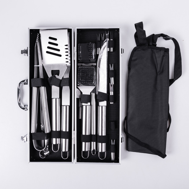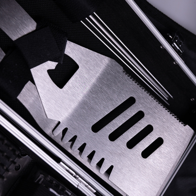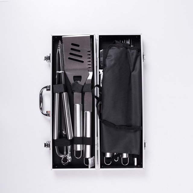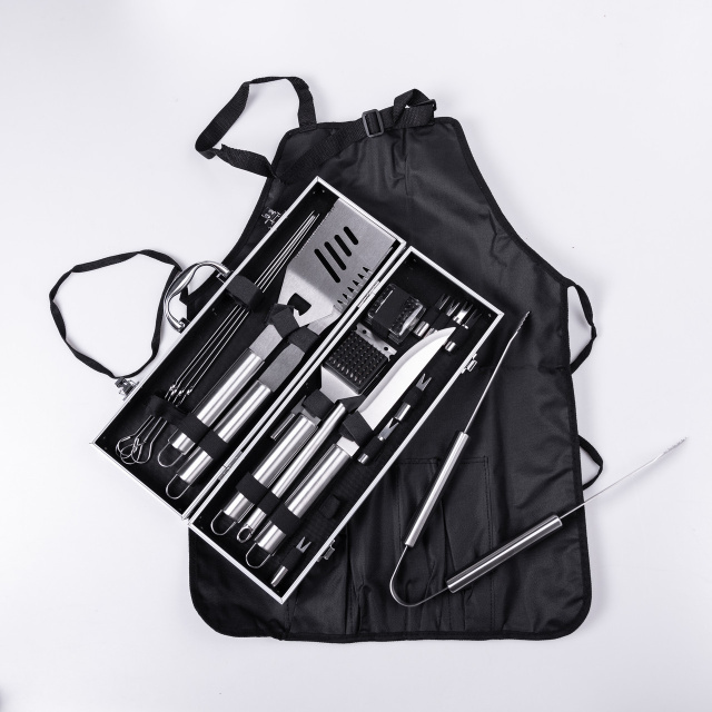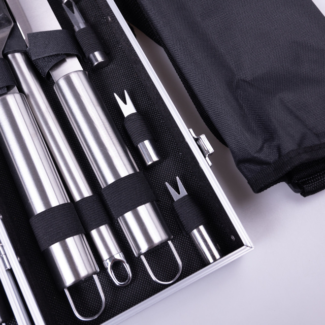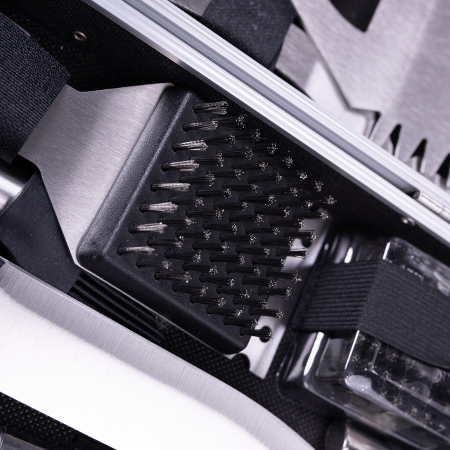 Набор аксессуаров для барбекю состоит из 19 предметов, изготовленных из нержавеющей стали. Материал обеспечивает прочность, устойчивость к высоким температурам и коррозии, что делает изделия пригодными для использования на открытом воздухе. Гладкая поверхность облегчает очистку после приготовления пищи. Основные характеристики: Размеры набора: 42х14х7.5 см; Длина приборов: 38, 29, 6 см; Количество предметов в наборе: 19; Материал: нержавеющая сталь, пластик. Комплектация: нож; лопатка; вилка для мяса; щипцы; 4 шампура; щетка для чистки гриля с запаской; 8 держателей для кукурузы; фартук. В комплект входят основные инструменты, необходимые для приготовления барбекю. Эргономичная форма обеспечивает удобство в использовании, а оптимальная длина ручек позволяет работать с горячими продуктами на безопасном расстоянии. Конструкция изделий предусматривает надежность соединения ручек с рабочими частями, что повышает долговечность приборов. Набор укомплектован кейсом для удобной транспортировки и хранения. Компактный формат позволяет легко переносить приборы и хранить их в упорядоченном виде, что особенно удобно для выездов на природу, пикников и кемпинга.