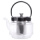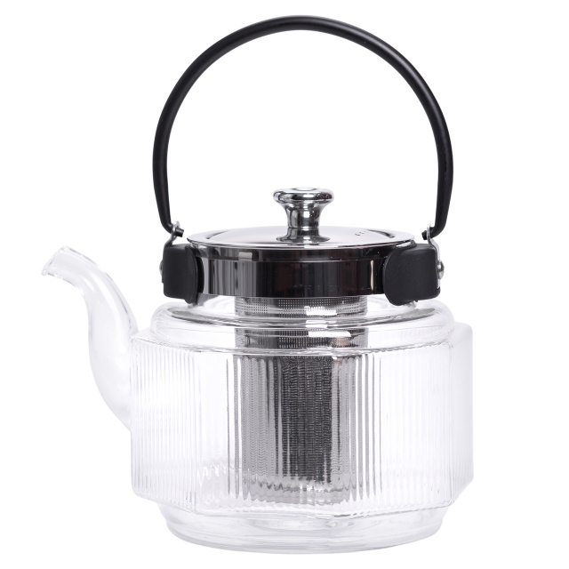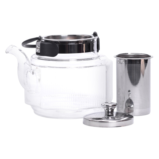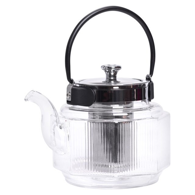 Стеклянный чайник с фильтром предназначен для заваривания листового чая, травяных сборов. Корпус изготовлен из жаропрочных стекол, которые выдерживают высокие температуры и позволяют наблюдать за процессом заваривания. Фильтр с металлической сеткой обеспечивает эффективное отделение чая от напитка. Черная ручка эргономичной формы изготовлена из термостойкого материала, что предотвращает нагрев во время использования и обеспечивает комфортное удержание. Благодаря прозрачным стенкам можно контролировать насыщенность напитка и своевременно прекращать заваривание. Конструкция чайника разборная, что упрощает его очищение. Характеристики стеклянного чайника для заваривания Размер: 18×14×21 см; Объем: 1.1 л; Высота: 12 см; Верхний диаметр: 5 см; Нижний диаметр: 12 см; Материал: cтекло + металл; Наличие: фильтра да. Преимущества стеклянного заварника Чистый вкус чая: стекло не впитывает запахи и не влияет на аромат напитка. Встроенный фильтр: задерживает листья, обеспечивая чистую подачу. Эргономичная ручка: безопасный захват без риска обжечься. Термостойкость: устойчив к высоким температурам, подходит для кипятка. Прозрачность: вы контролируете степень заваривания в реальном времени. Эстетичный дизайн: отлично смотрится на кухне и сервировочном столе. Универсальность: подходит для чёрного, зелёного, травяного чая и цветочных сборов. Такой чайник подходит для ежедневного использования дома или офиса, позволяя быстро приготовить ароматный чай или кофе без дополнительных аксессуаров. Он сочетает удобство, простоту ухода и аккуратный внешний вид.